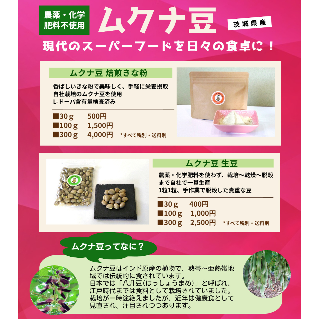農薬・化学肥料を使わず、自社で栽培したムクナ豆を使用